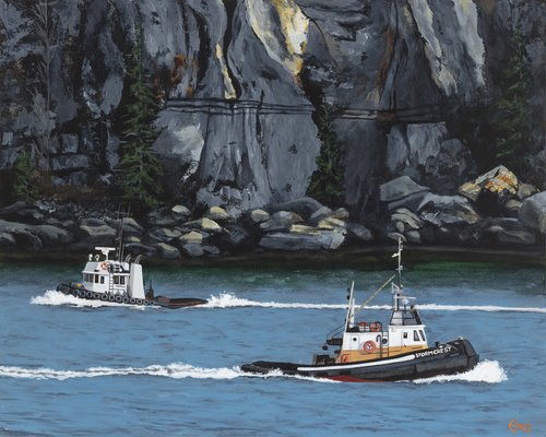 “Team Work” The photo I used for this painting was taken by M.L. Jacobs (Malcolm) Malcolm passed away unexpectedly in 2019. He was a longtime member of Marine Traffic and that is where I found this photo. His wife Jan now looks after his photos. He has many amazing photos for you to view on marine traffic or at www.mljacobsphotography.com He loved the water, ships and boats on the West Coast as passionately as I do. I feel grateful to have had the opportunity to paint this in his honor.